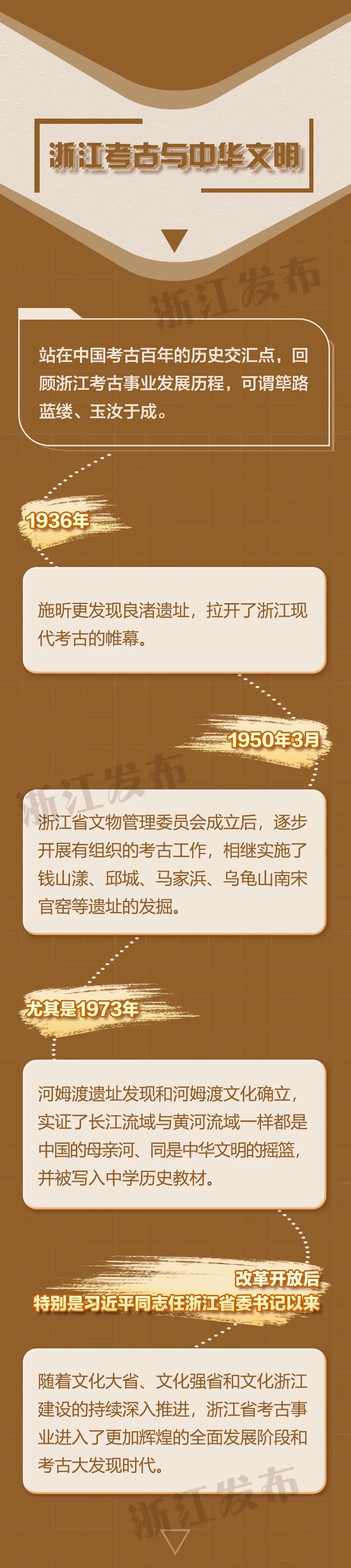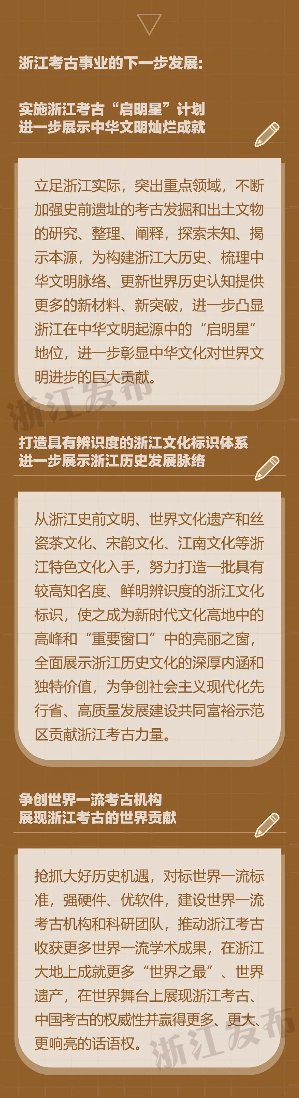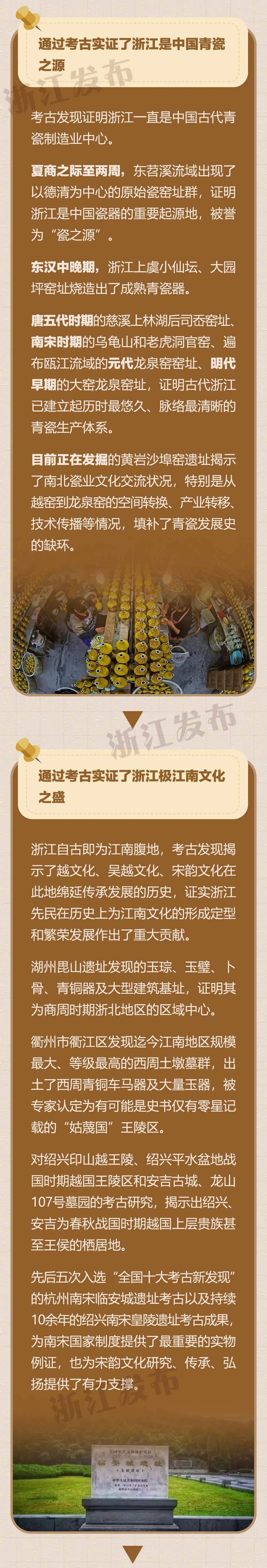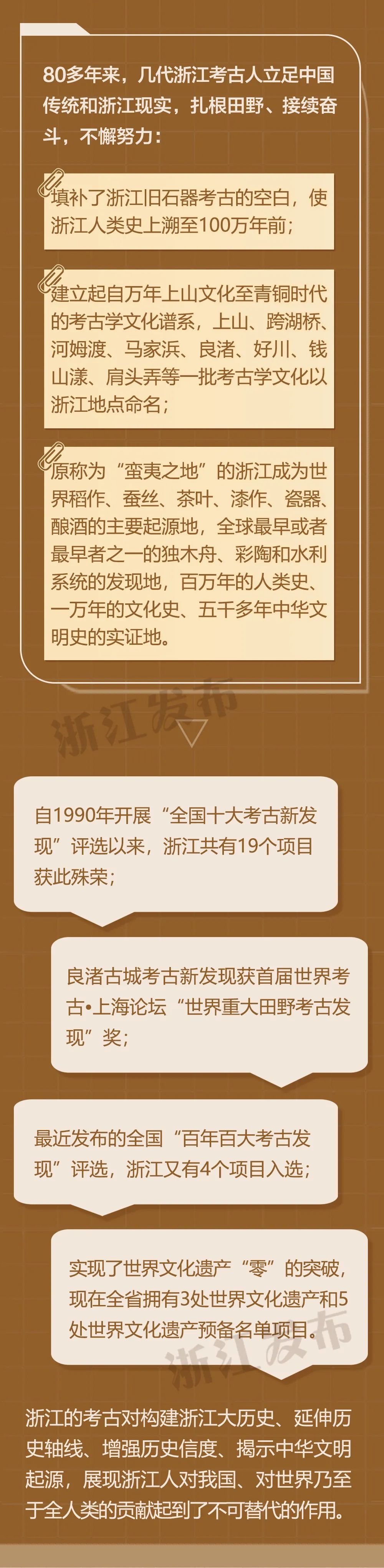 浙江考古重要新发现层出不穷,成就引人瞩目。用80余年时间还原了中国百万年的历史,构建起浙江一万年的文化发展谱系和年代框架,实证了中华五千多年的文明史,为中国考古学的学术体系、话语体系建设以及世界考古学发展贡献了重要力量。