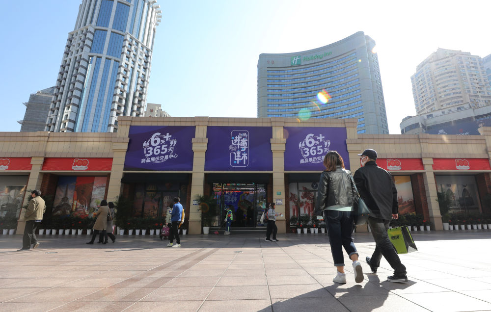 11月8日拍摄的位于上海南京东路步行街的进博集市外景。(新华社记者方喆摄)