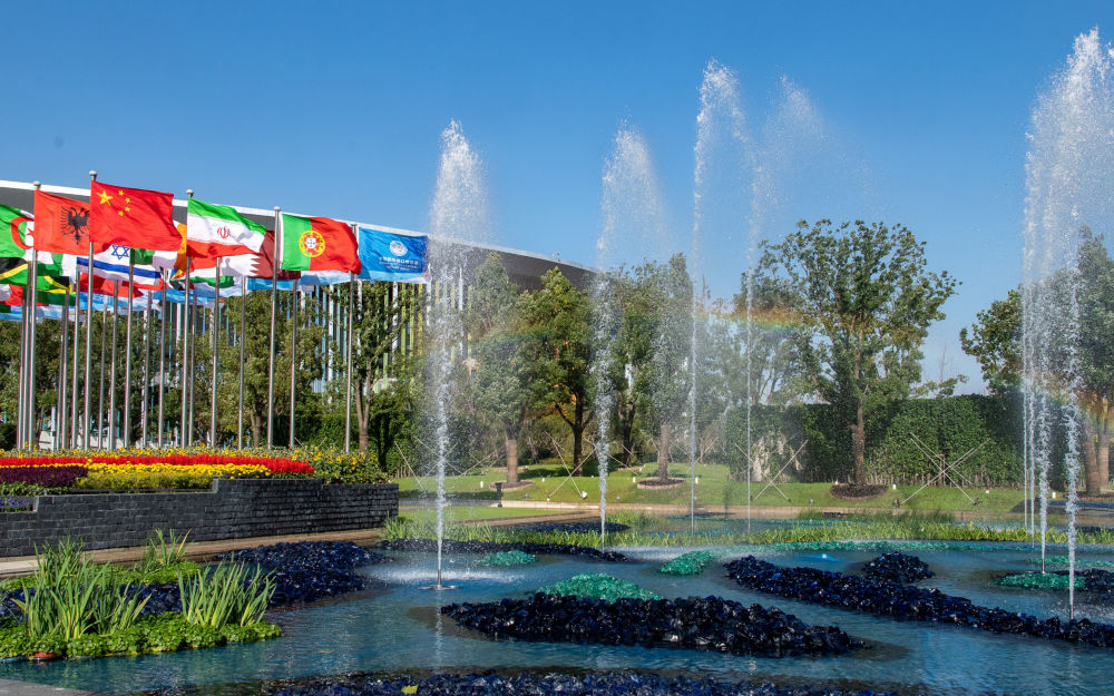 11月8日在国家会展中心(上海)南广场喷泉前拍摄的彩虹。(新华社记者邬惠我摄)