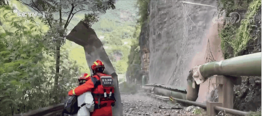 暴雨过后,山体滑坡,路边滚石不断飞落。 危急时刻,消防员用铁板做成最简易的护身工具。而他们自己就是被困群众的护身盾牌,护送被困群众一步一步走出危险地带。