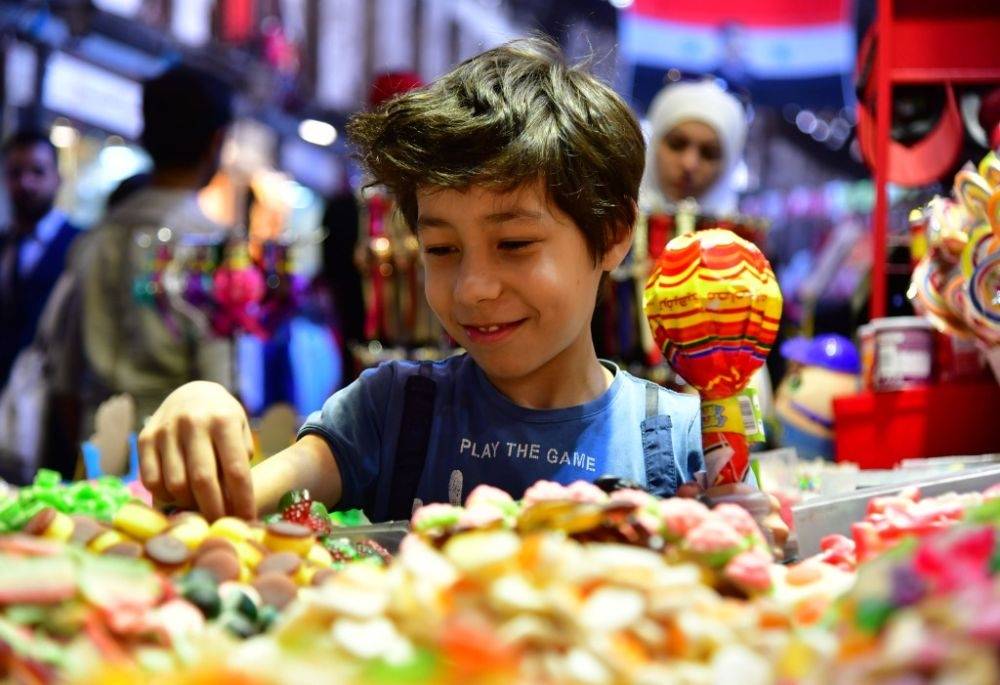 5月11日,一名儿童在叙利亚首都大马士革的市场上挑选糖果。(新华社发,阿马尔·萨法尔贾拉尼摄)