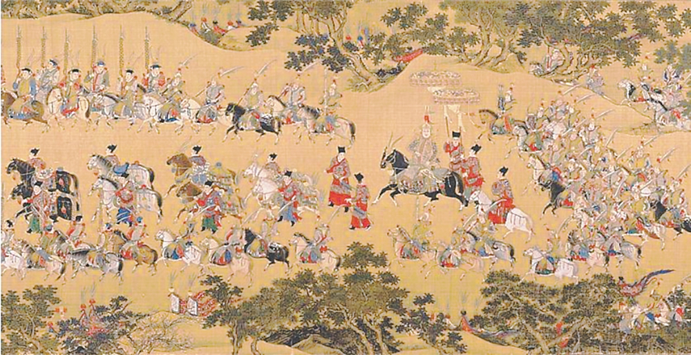 (明)《出警入跸图》(局部)。图中红衣黑帽的护卫即锦衣卫,随侍在万历皇帝左右。