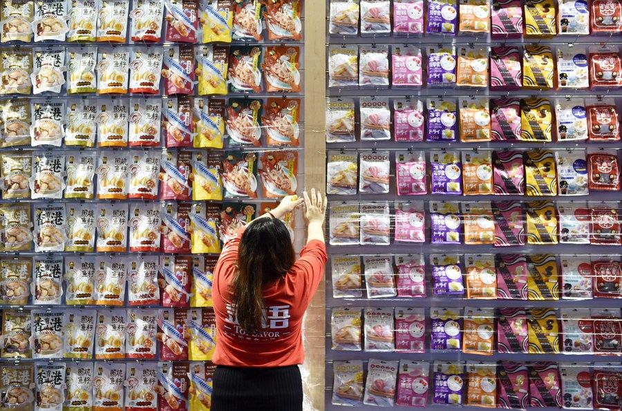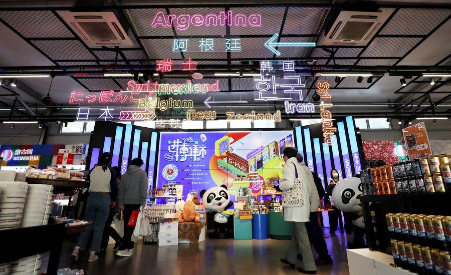 11月8日,顾客走过进博集市内一处各国商品集中展示台。(新华社记者方喆摄)