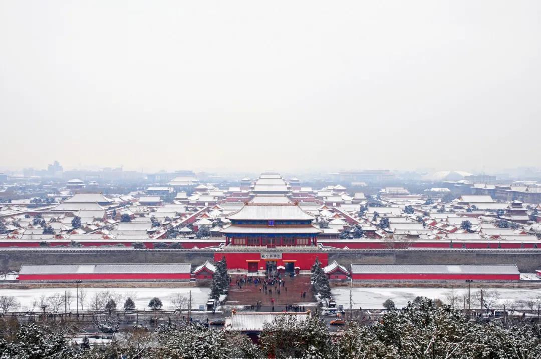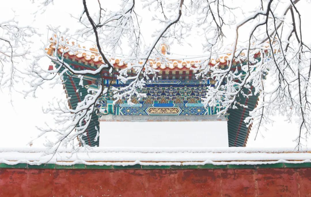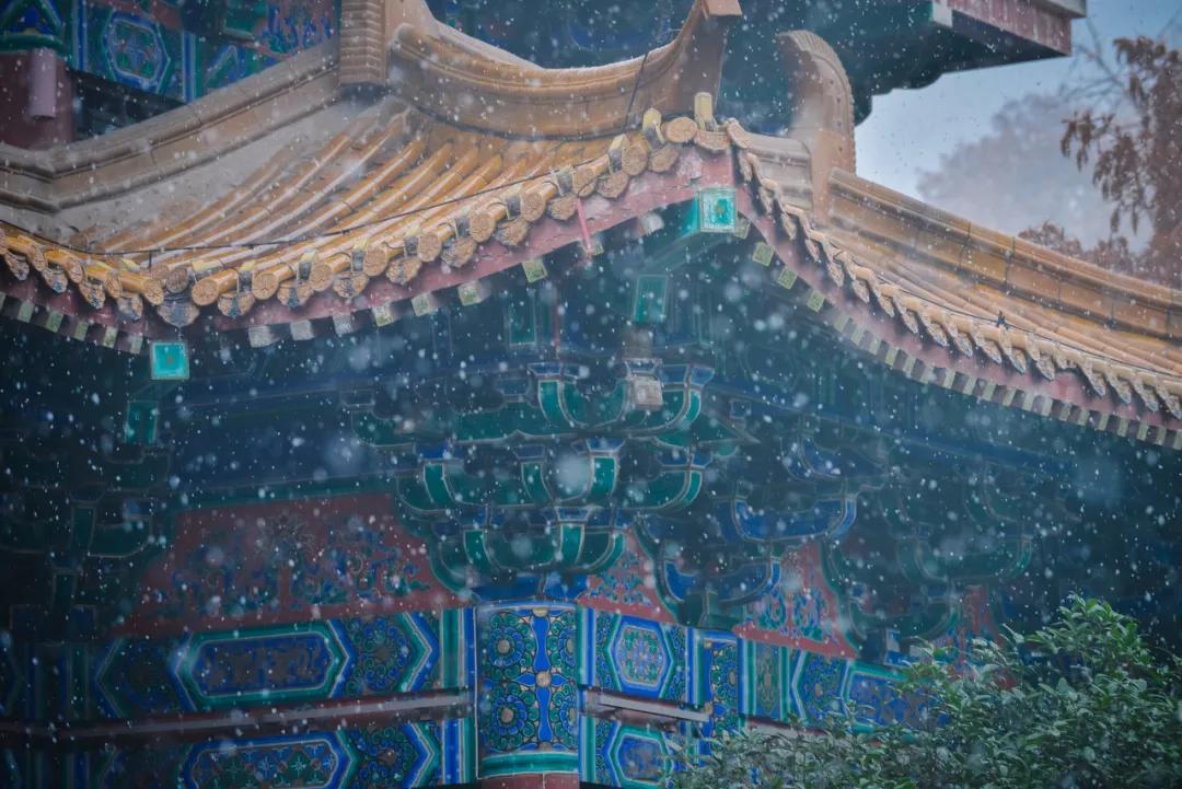 白雪勾勒出每一座宫殿的轮廓,覆盖着深宫琉璃瓦的屋檐。