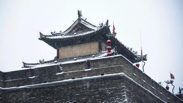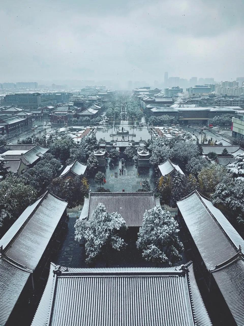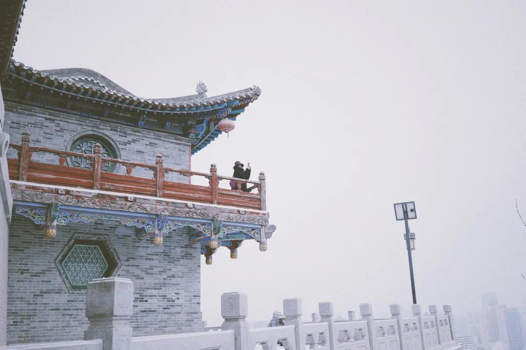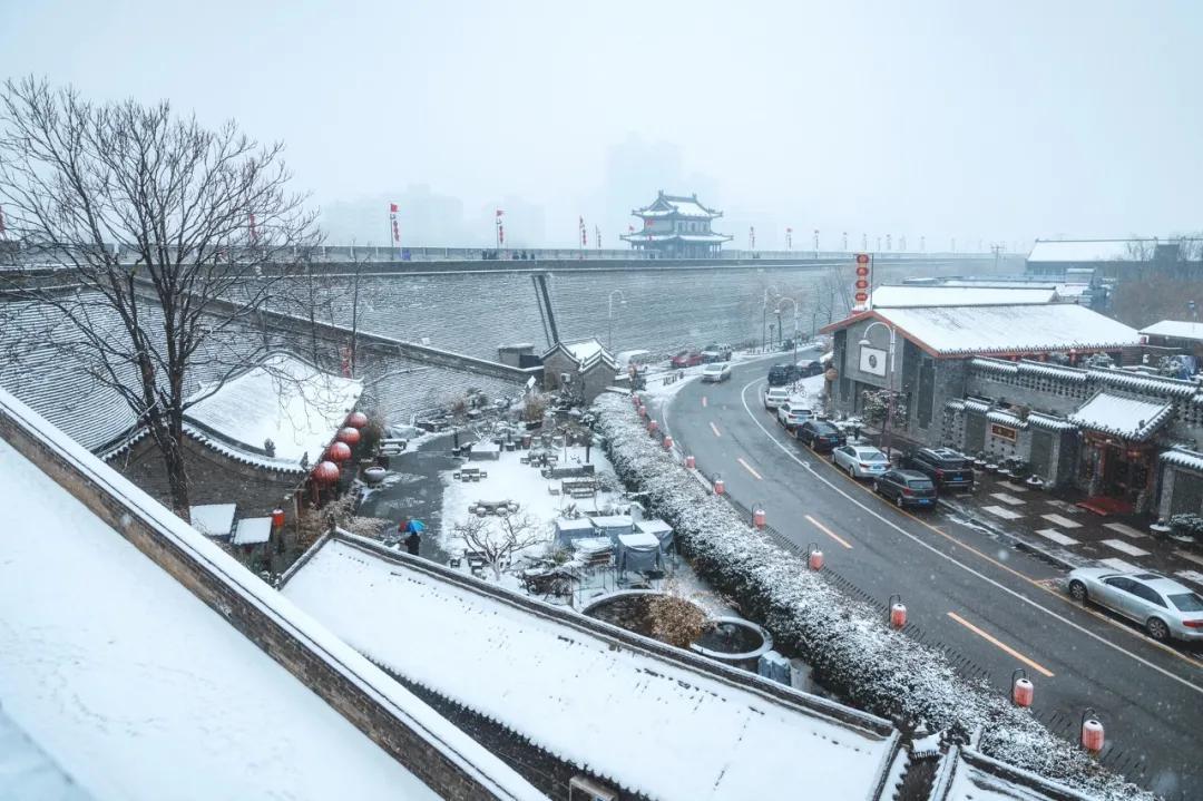 西安长街上雪花飞舞,历史的遗迹在雪中静默,任人驻足仰望。
