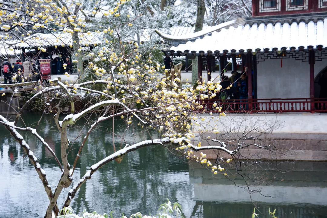纷扬的雪落在庄严的紫禁城,落在苏州拙政园的腊梅上,