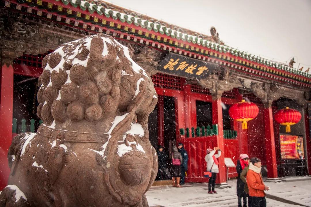 抬头看那高高翘起的檐角乘着白雪,房顶上的瑞兽披着白雪仿佛瞬间腾跃。