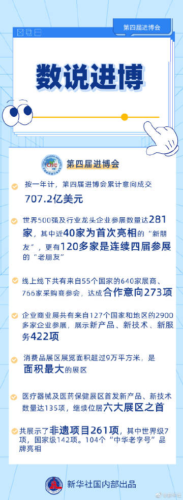 【#数说进博#】第四届进博会诸多数据11月10日新鲜出炉!按一年计,本届进博会累计意向成交金额707.2亿美元,展示新产品、新技术、新服务422项,世界500强及行业龙头企业参展数量达281家……这份清单请阅⬇#开放的中国与世界共赢#(记者:于佳欣、邵艺博)