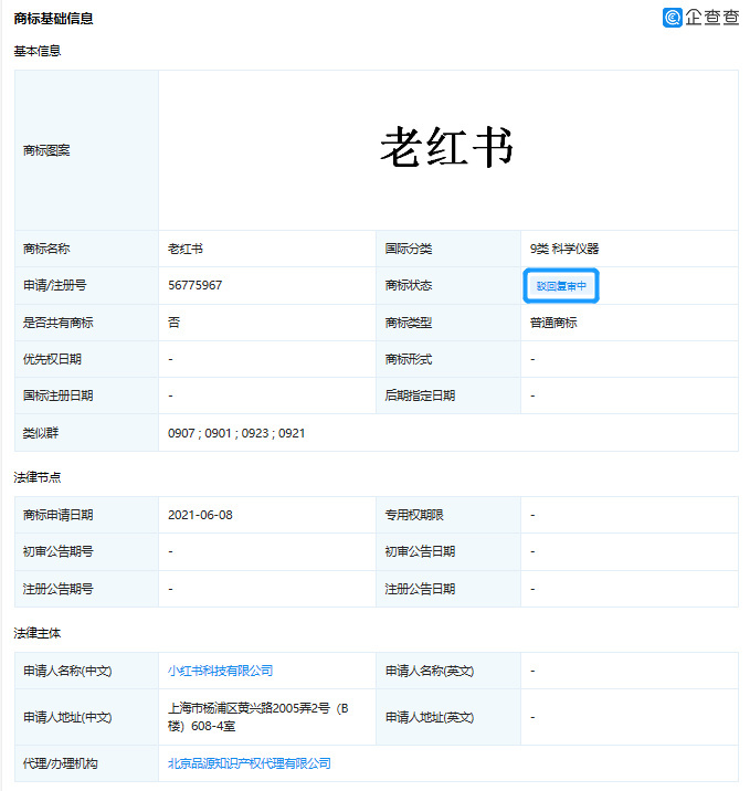 IT之家 11 月 10 日消息,信息显示,近日,小红书科技有限公司申请的“老红书”商标状态变更为驳回复审,该商标国际分类涉 9 类科学仪器,申请日期为 6 月 8 日。