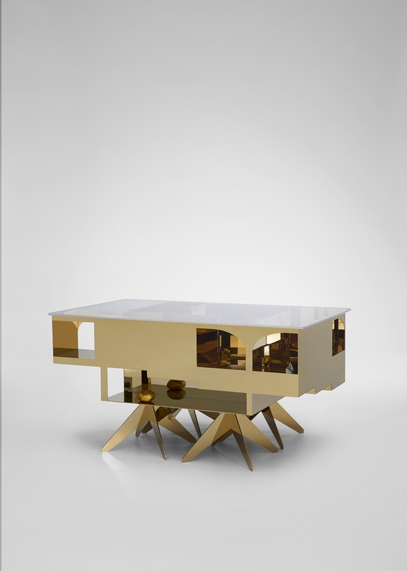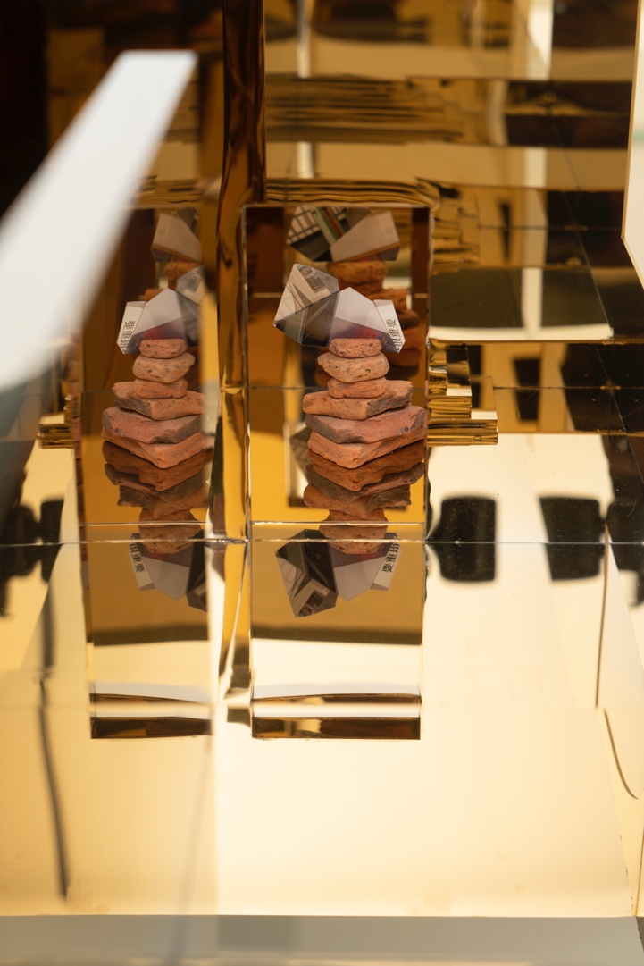 此作品基于陈彧君2021年在龙美术馆的展览所进行的创作,利用回收废弃的不锈钢材质、杂志以及从家乡拾回的废弃瓦片重塑了一件将展览留作时光记忆的现场模型样式的艺术作品,一个“展中展”;同时又成为一件实用的家具,将环保的艺术实现模式由艺术作品呈现转向生活实用物的再创造,延续了他“如何让旧物的价值再生”的探讨。