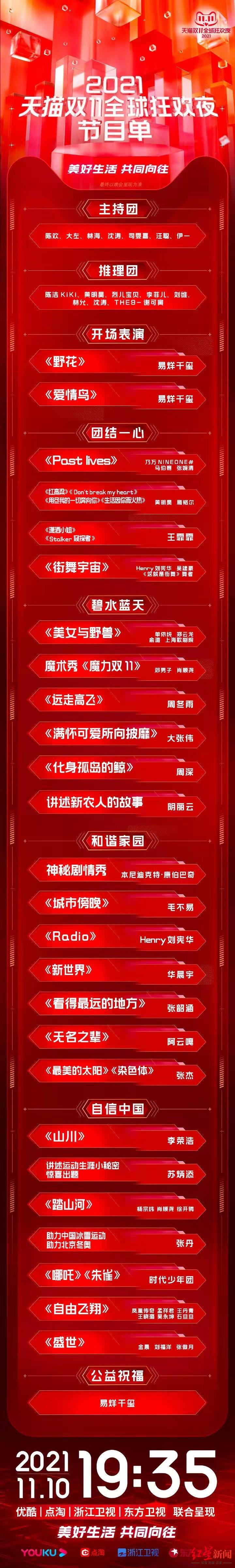 每年的双11狂欢夜,艺人阵容都是大家非常关注的。今年的阵容也非常重磅,“卷福”、易烊千玺,等等。“我们选择艺人,第一是当下受大家欢迎的艺人,并且他(她)表现出来的状态是能够激励大家的。其次也选择了一些不是表演型节目的艺人,打破只有歌舞表演的模式。当然也考虑了国际化,晚会是全球播放,所以还邀请了国际艺人。”
