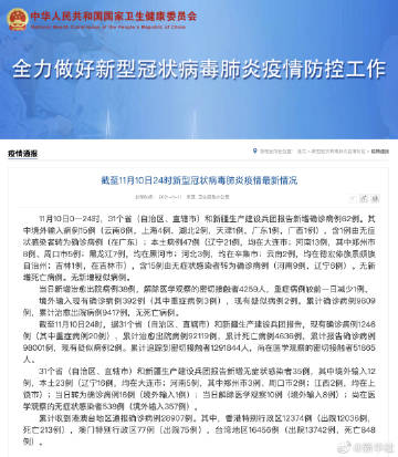 截至11月10日24时,据31个省(自治区、直辖市)和新疆生产建设兵团报告,现有确诊病例1246例(其中重症病例20例),累计治愈出院病例92119例,累计死亡病例4636例,累计报告确诊病例98001例,现有疑似病例2例。累计追踪到密切接触者1291844人,尚在医学观察的密切接触者51865人。