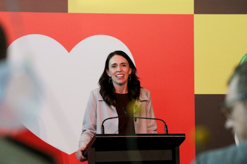 4月19日,新西兰总理阿德恩在惠灵顿机场发表讲话,欢迎从澳大利亚飞来的旅客。(新华社发,孟韬摄)