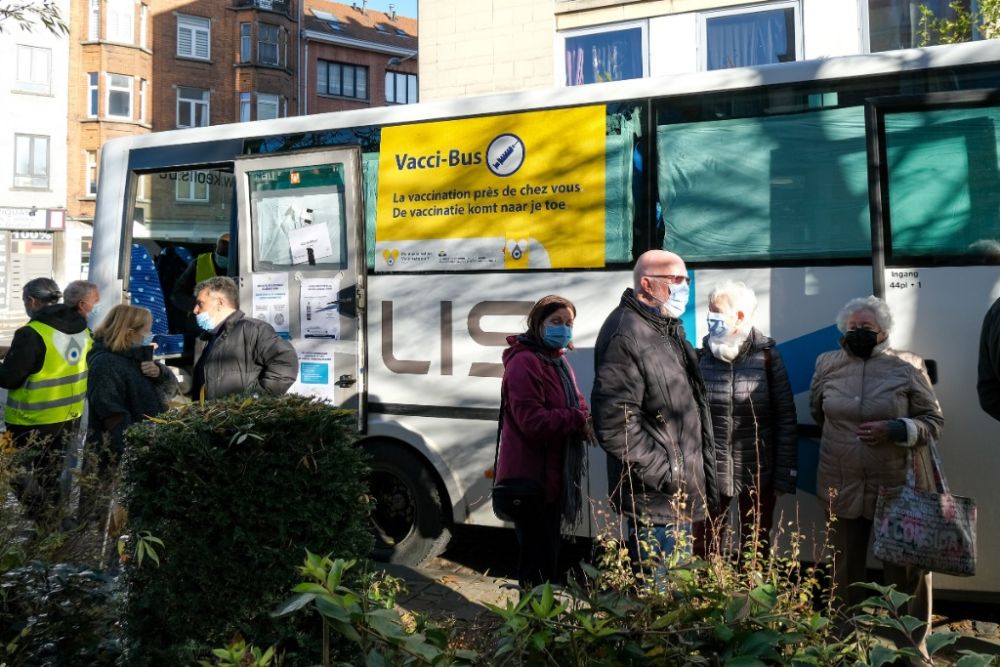 11月9日,人们在比利时布鲁塞尔一辆“疫苗巴士”前排队接种新冠疫苗。(新华社记者张铖摄)