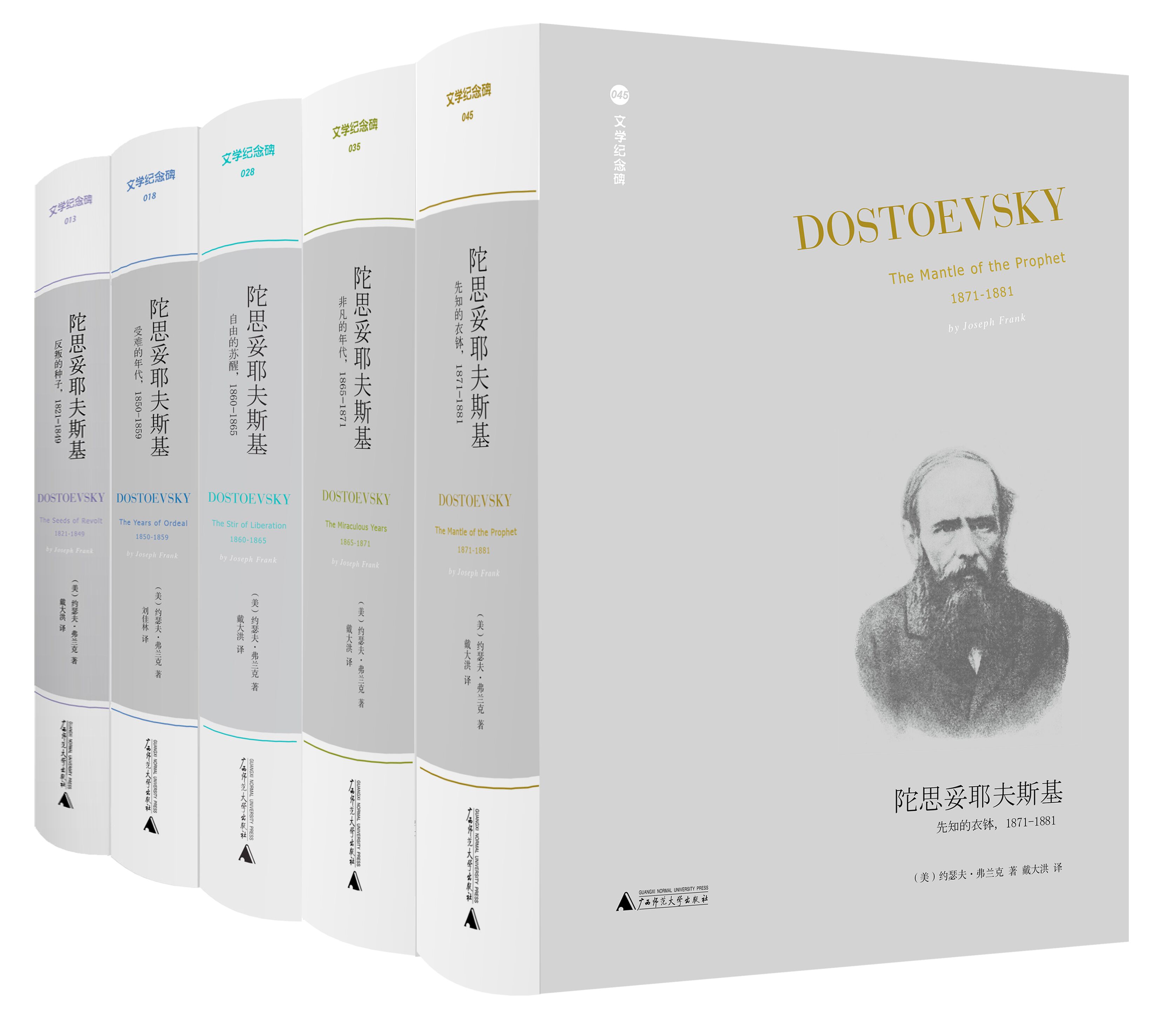 2014年,广西师范大学出版社知名图书品牌“文学纪念碑”丛书推出了陀思妥耶夫斯基权威研究者、普林斯顿大学、斯坦福大学荣休教授约瑟夫·弗兰克五卷本《陀思妥耶夫斯基》的第一卷《陀思妥耶夫斯基:反叛的种子,1821—1849》,此前已出版陀思妥耶夫斯基的第二任妻子安娜所写的《安娜·陀思妥耶夫斯卡娅回忆录》《一八六七年日记》《同时代人回忆陀思妥耶夫斯基》。此后,“文学纪念碑”陆续推出第二卷《陀思妥耶夫斯基:受难的年代,1850—1859》、第三卷《陀思妥耶夫斯基:自由的苏醒,1860—1865》。同时,还特别推出《罪与罚》的学术评论版。这些图书共同构成了“文学纪念碑”的陀思妥耶夫斯基版块。今年6月,在读者们的翘首期盼中,“文学纪念碑”推出了第四卷《陀思妥耶夫斯基:非凡的年代,1865—1871》(第五卷尚未出版)。
