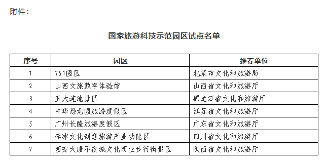 为促进旅游科技发展,推动科技赋能旅游业,文化和旅游部决定对7个园区开展国家旅游科技示范园区试点工作。