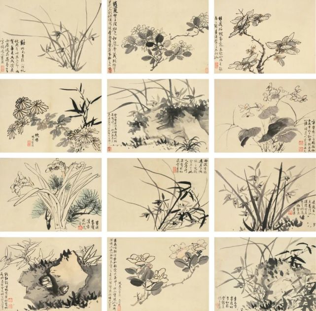 《花卉兰竹石册》,明代,蓝瑛,1646年作,设色纸本,共计十二册,每册纵23.5厘米,横32.5厘米,约0.69平尺。