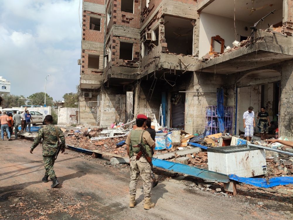 10月10日,安全人员聚集在也门亚丁的汽车炸弹袭击现场。(新华社发,穆拉德·阿卜杜摄)