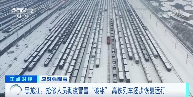 央视网消息:经铁路抢修人员彻夜清冰,黑龙江受暴雪冰冻天气影响的高铁线路运输秩序逐步恢复,目前京哈高铁、哈佳铁路已正常运行。