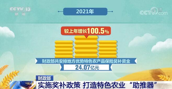 同时,为进一步完善保费补贴品种体系建设,支持地方优势特色农产品发展,目前财政部已在全国20个省份实施中央财政对地方优势特色农产品保险的以奖代补政策,支持地方自主选择不超过3个特色险种申请中央财政奖补资金。2021年,财政部共安排地方优势特色农产品保险奖补资金24.07亿元,较上年增长100.5%。例如,广东荔枝、湖北小龙虾、湖南柑橘、陕西苹果、宁夏枸杞、内蒙古肉牛等地方特色农产品已被纳入奖补覆盖范围。
