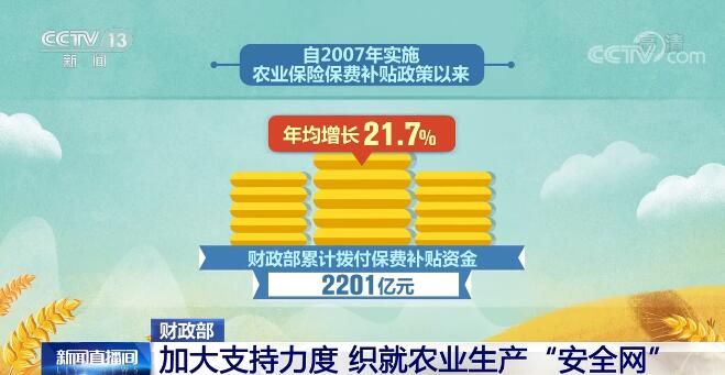 据了解,自2007年实施农业保险保费补贴政策以来,财政部累计拨付保费补贴资金2201亿元,年均增长21.7%。2020年,财政部拨付保费补贴资金285.39亿元,推动我国成为全球农业保险保费规模最大的国家,实现保费收入815亿元,为1.89亿户次农户提供风险保障4.13万亿元,中央财政补贴资金引导和使用效果放大近145倍。2021年,财政部进一步加大农业保险支持力度,预计为超过2亿户次农户提供风险保障5万亿元,持续为我国农业生产保驾护航。