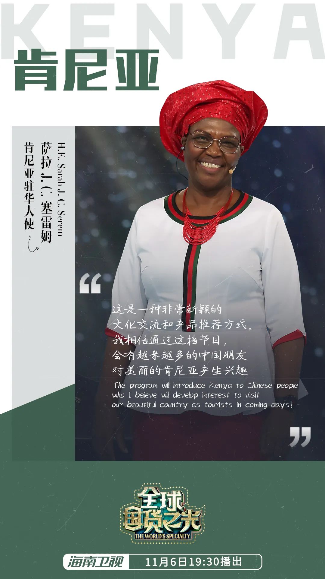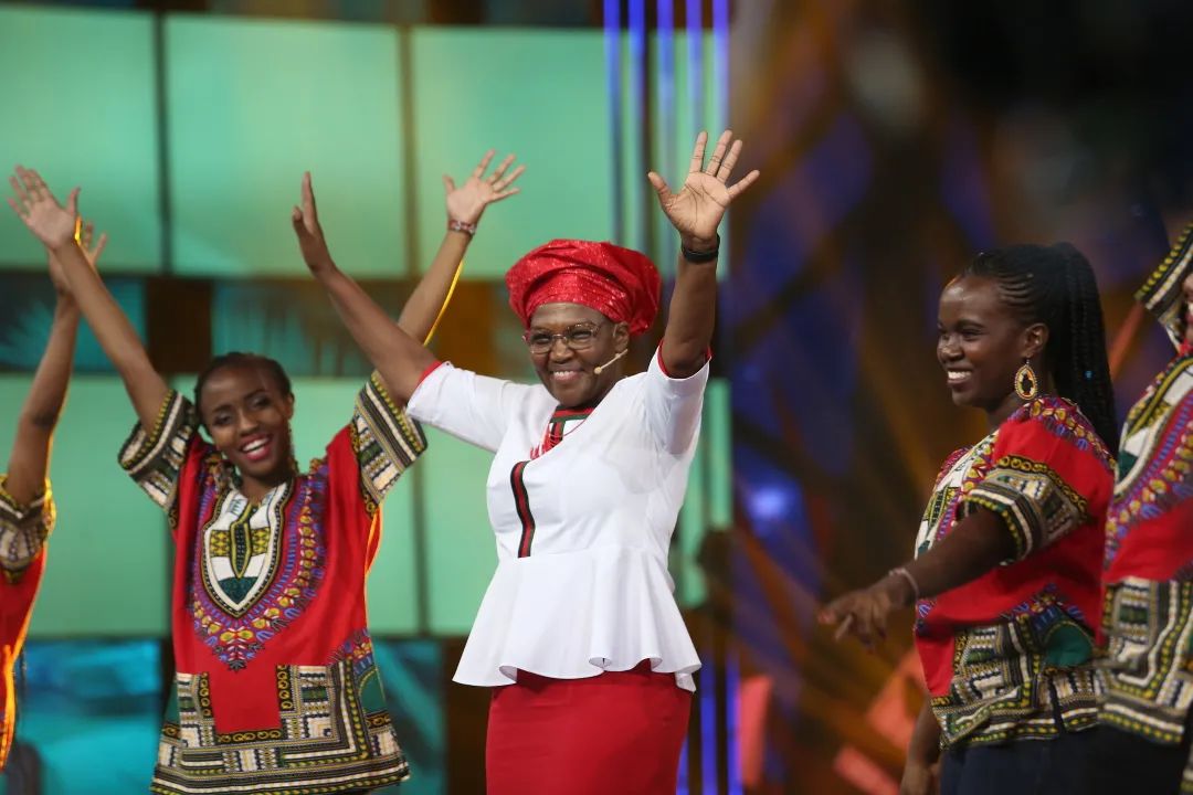 “晚上好,欢迎来到《全球国货之光》节目,今天我很高兴能够来到演播室,为大家展示我们肯尼亚的产品。”舞台上,热情洋溢、笑容满面的女士正是肯尼亚共和国驻华大使萨拉J·C·赛雷姆,她全情投入,为观众推介着自己的家乡——肯尼亚。她还带着肯尼亚驻华大使馆参赞埃德文·李默以及多位肯尼亚在华留学生一同登上舞台。