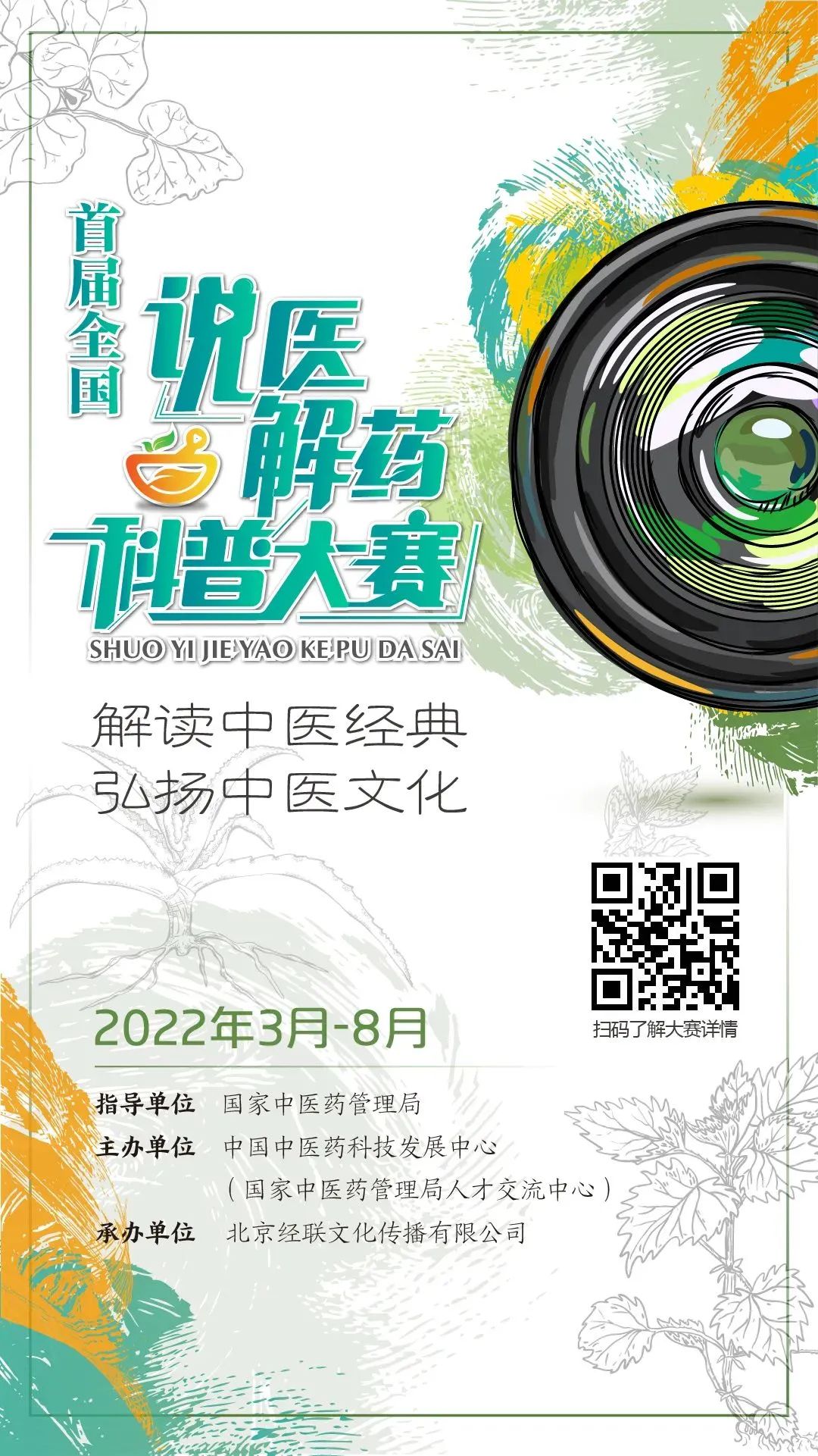 为进一步落实国务院办公厅印发的《关于加快中医药特色发展若干政策措施》和国家中医药管理局等五部委印发的《中医药文化传播行动实施方案(2021—2025年)》,弘扬中医药文化,增强文化自信,推动中医药文化进校园、进社区,讲好中医故事,传播好中医声音,推广一批中医药经典科普作品,培养一批优秀的中医药科普人才,由国家中医药管理局指导, 中国中医药科技发展中心主办的首届全国说医解药科普大赛将于2022年3月到8月举办。