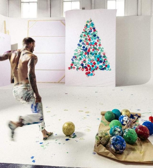 拍摄前,贝克汉姆先在足球表面涂上各种颜色的涂料,然后开始花式炫技,直接踢出任意球,这样玩下来,一棵五彩斑斓的圣诞树就诞生了。