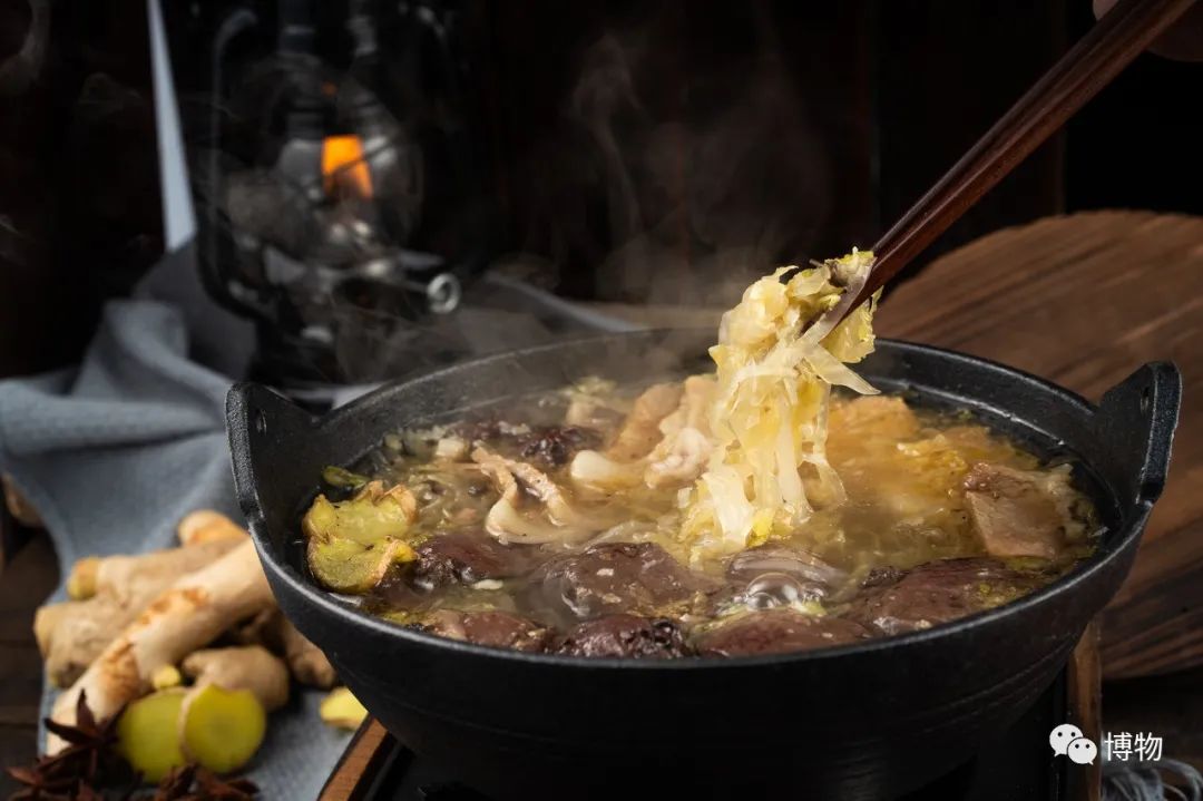 杜甫诗说“长安冬菹酸且绿”,宋人的冬令小诗里,也有“菹菘晚自嘉”的句子,“菹(zū)”就是酸菜的古称,“菘(sōng)”则是白菜,可见冬天腌酸菜古已有之。因为冬天气温低,致腐的微生物不活跃,此时腌菜,不易腐败。而且天寒地冻时,用刚腌好的酸菜热腾腾炖上一锅,驱寒又解腻,再爽快不过了!