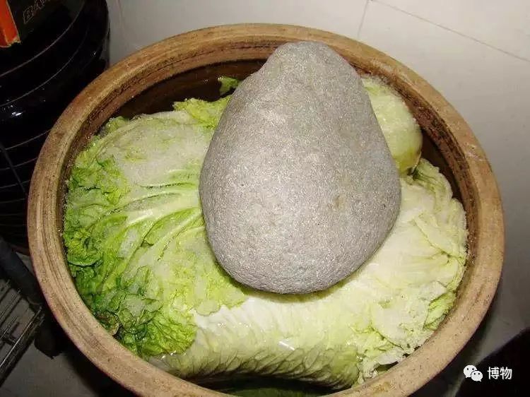白菜晾晒后,去掉枯叶、老帮,焯水再晾凉,一层菜一层盐,在一米多高的大缸里码至缸口,找块大石头压住。静置数日,让空气中的乳酸菌和白菜充分接触,再在缸内加满清水,密封起来——现在多用透明塑料薄膜来封,便于查看缸里的情况。约莫一个月,就能得到一缸酸香扑鼻的好酸菜。