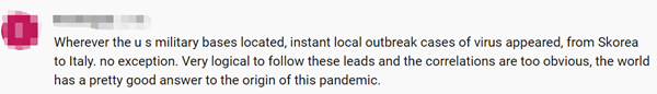 译文:从韩国到意大利,美国军事基地建在哪里,哪里就立刻暴发了新冠疫情,无一例外。视频里的线索非常符合逻辑,这一切(与美国)的关联性太强了。