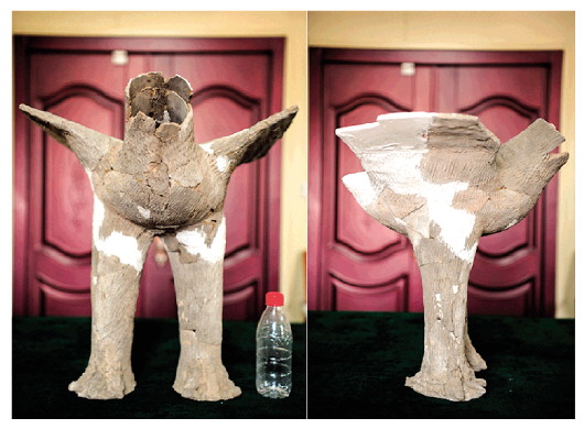 石峁遗址内出土的陶鹰(拼版照片,2018年3月27日摄)。新华社发(张博文摄)