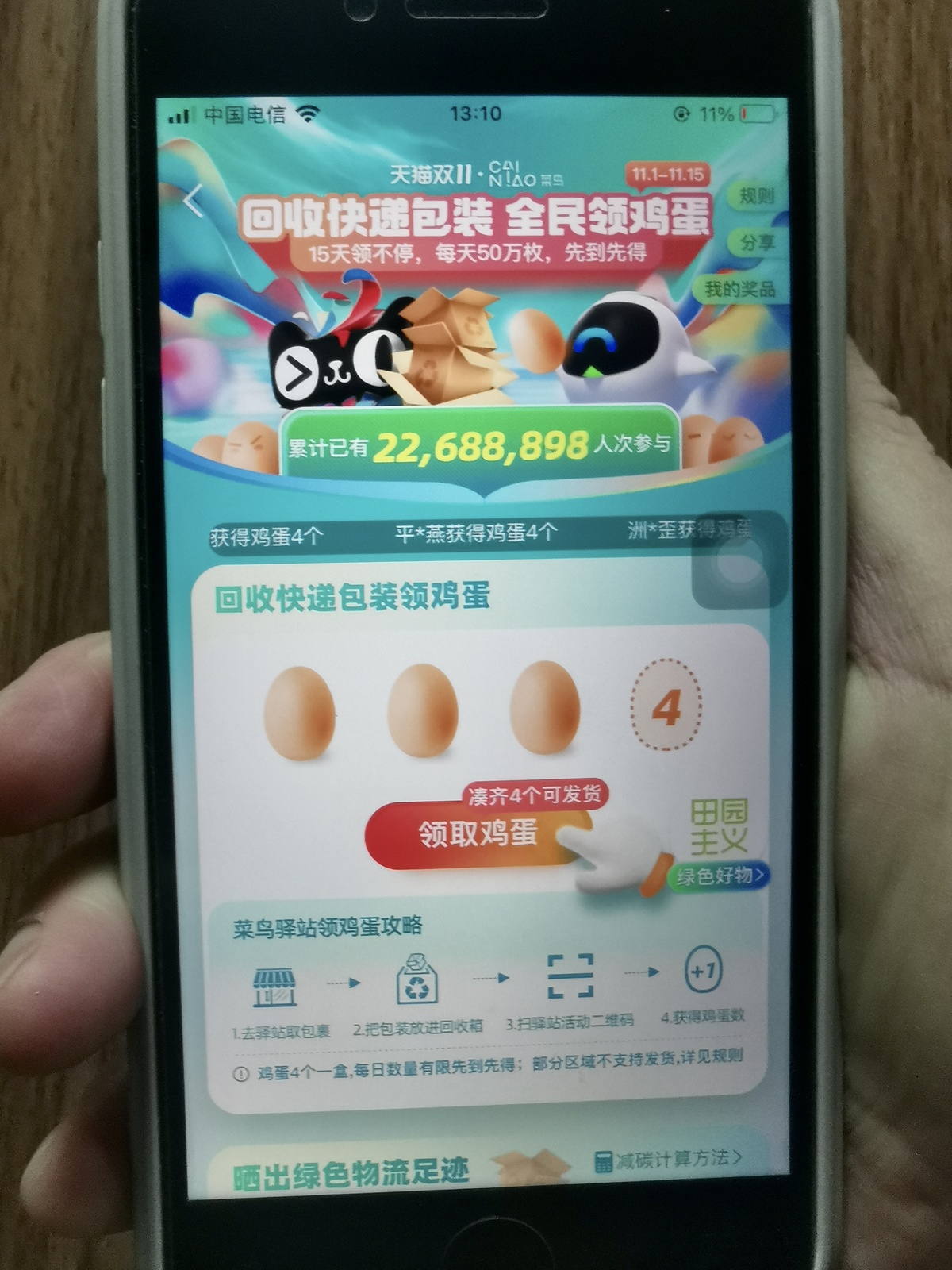 11月以来,菜鸟网络推出了“回收快递包装领鸡蛋”活动,每天准备了50万枚鸡蛋回馈参与绿色环保活动的用户。数据显示,全国6万个菜鸟驿站当前累计参与人次已超过2300万。