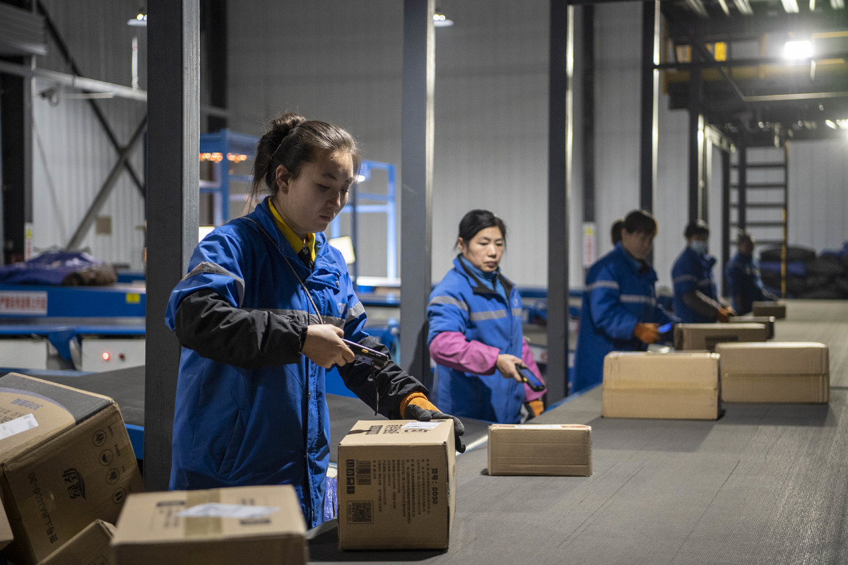 工作人员在中通快递太原转运中心内分拣包裹。新华社记者 杨晨光 摄