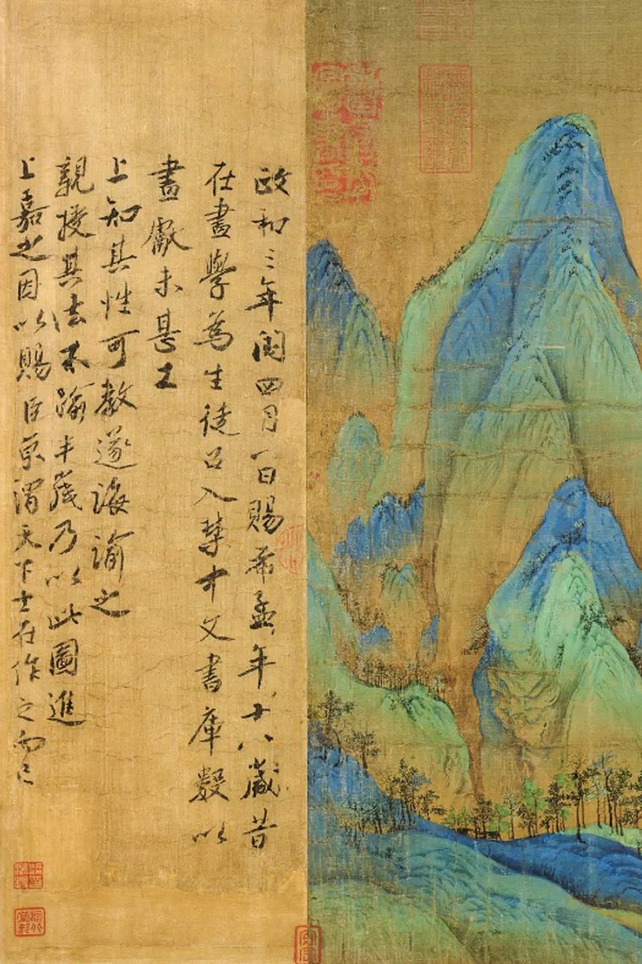 “政和三年闰四月八日赐。希孟年十八岁,昔在画学为生徒,召入禁中文书库,数以画献,未甚工。上知其性可教,遂诲谕之,亲授其法,不逾半岁,乃以此图进。”