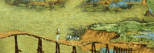 正如陈丹青在《局部》说,少年的世界是全息的世界。画中有屋舍舟船,群山大起大伏,丛林层次繁复,往来众人卸船卸货,哪怕一颗鹅卵石,画家都将起纹路描绘得详细可见。