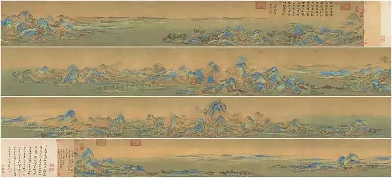 《千里江山图》是宋徽宗朝的一幅画,与《清明上河图》是同时期的作品,但面积比它大四倍,高半米余,长近12米。
