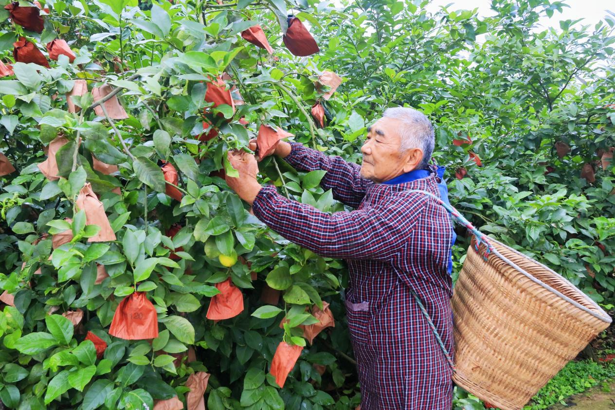 年近八十岁的村民祝光吉在摘柠檬。(朱国强摄)
