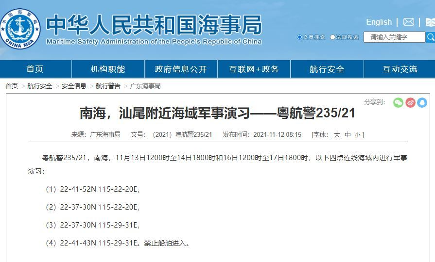 据中国海事局网站消息,广东海事局发布航行警告,11月13日12时至11月14日18时、11月16日12时至11月17日18时,南海汕尾附近海域将进行军事演习,禁止船舶驶入。
