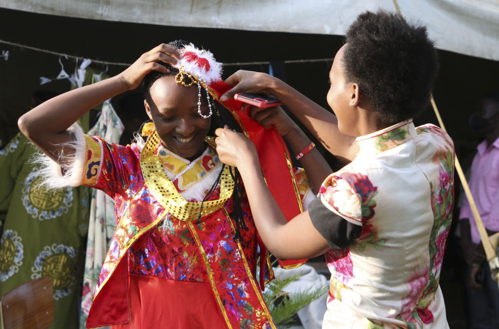 11月10日,学生在卢旺达卡永扎试穿中国服饰。(新华社记者吉莉摄)