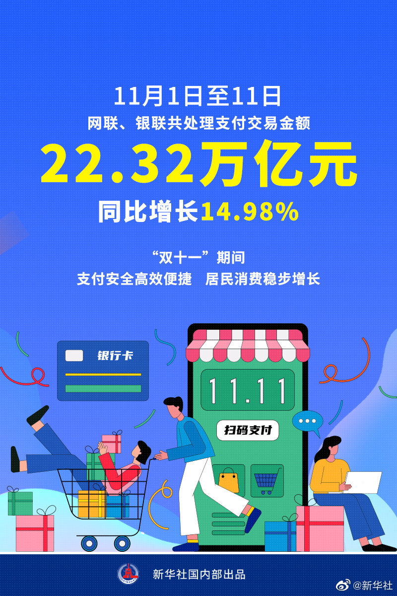 【双十一期间网联和银联共处理支付交易22.32万亿元】中国人民银行12日发布数据显示,“双十一”期间(11月1日至11月11日)网联、银联共处理支付交易270.48亿笔,金额22.32万亿元,分别同比增长17.96%和14.98%。11日网联、银联合计最高业务峰值9.65万笔/秒。“双十一”期间,支付服务安全、高效、便捷,支付业务规模和居民消费稳步增长。(记者吴雨,海报设计杨轶群)