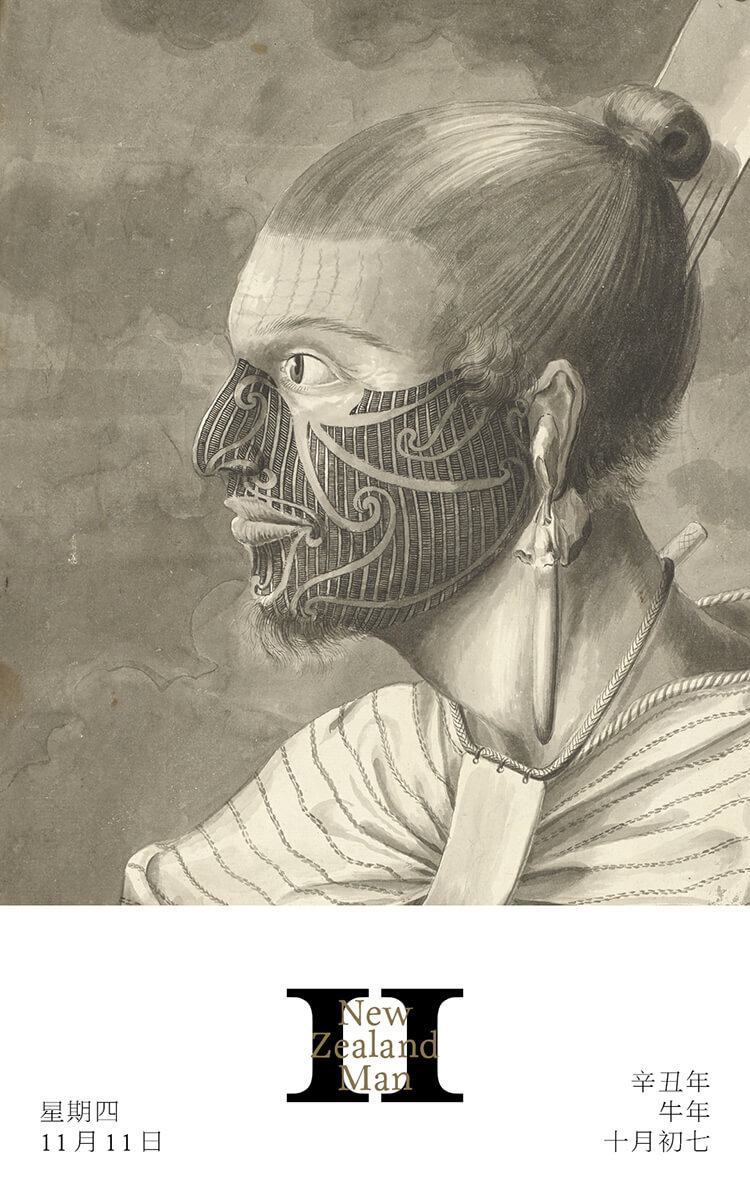 库克船长一行人在1769年年底航行到了新西兰北部海域的群岛湾,不久之后就遇到了这位酋长之子。他向后梳起的发髻上插着一把梳子,脖子上带着一串用鲸鱼牙齿制成的项链,显得威武又高贵。不过,酋长之子最让人印象深刻的地方,是他脸上的刺青。