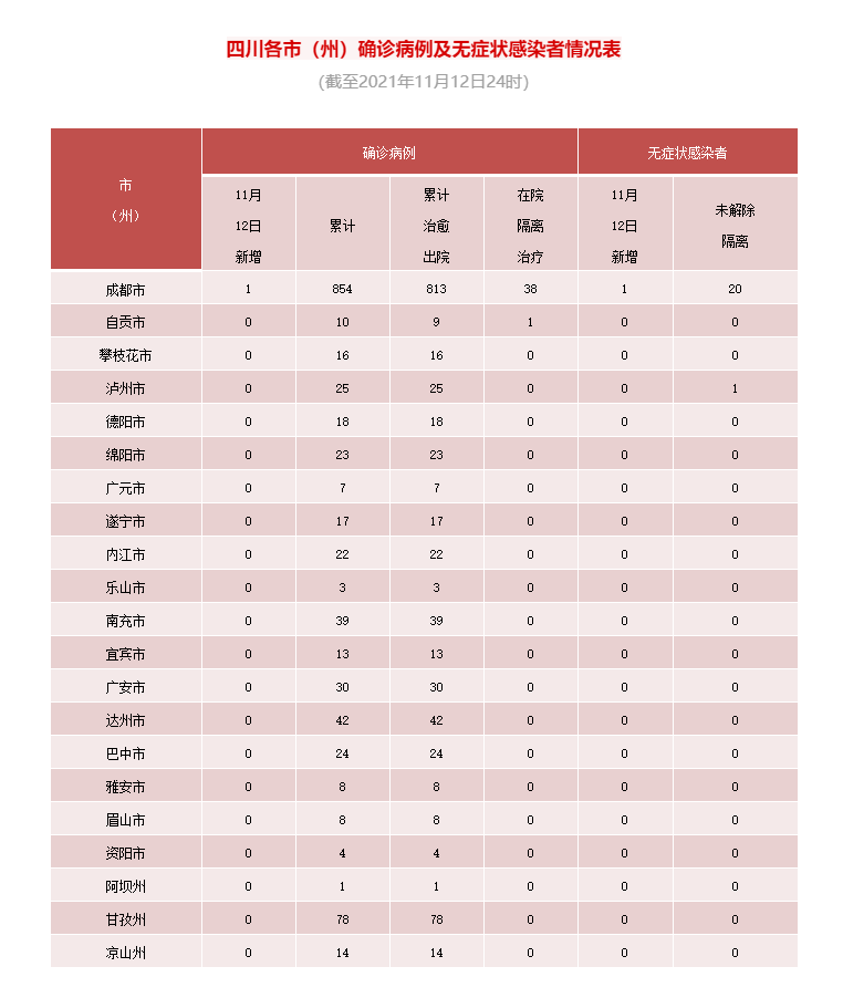 11月12日0-24时,四川新增新型冠状病毒肺炎确诊病例1例(本土,为成都市通报的确诊病例6的同事,11月5日作为密切接触者纳入集中隔离,11月12日确诊),新增治愈出院病例1例,无新增疑似病例,无新增死亡病例。