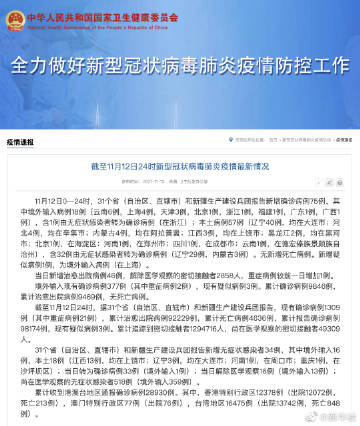 【#11月12日新增确诊病例75例# #11月12日新增本土病例57例#】据国家卫生健康委员会网站,11月12日0—24时,31个省(自治区、直辖市)和新疆生产建设兵团报告新增确诊病例75例。其中境外输入病例18例(云南6例,上海4例,天津3例,北京1例,浙江1例,福建1例,广东1例,广西1例),含1例由无症状感染者转为确诊病例(在浙江);本土病例57例(辽宁40例,均在大连市;河北4例,均在辛集市;内蒙古4例,均在阿拉善盟;江西3例,均在上饶市;黑龙江2例,均在黑河市;北京1例,在海淀区;河南1例,在郑州市;四川1例,在成都市;云南1例,在德宏傣族景颇族自治州),含32例由无症状感染者转为确诊病例(辽宁29例,内蒙古3例)。无新增死亡病例。新增疑似病例1例,为境外输入病例(在上海)。