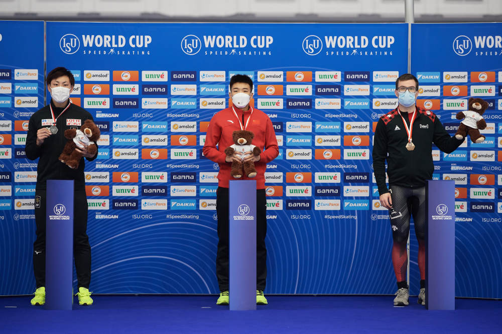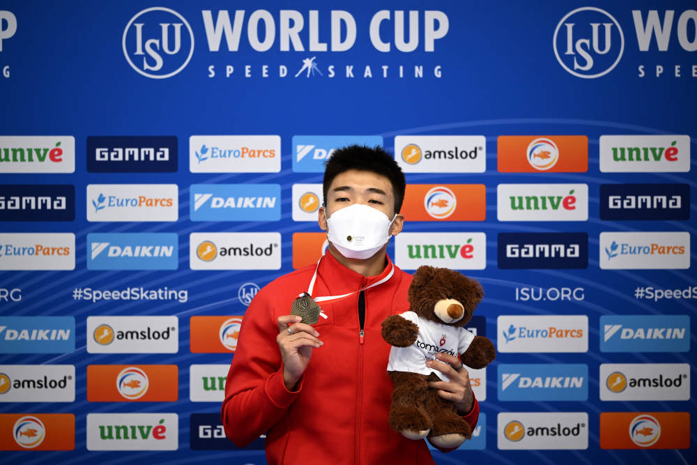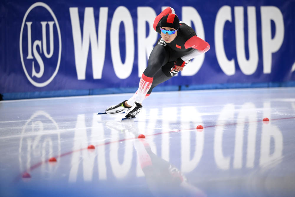 11月12日,在波兰马佐夫舍地区托马舒夫举行的国际滑联速度滑冰世界杯男子500米A组决赛中,中国选手高亭宇以34秒26的成绩获得冠军。新华社发(拉法尔摄)