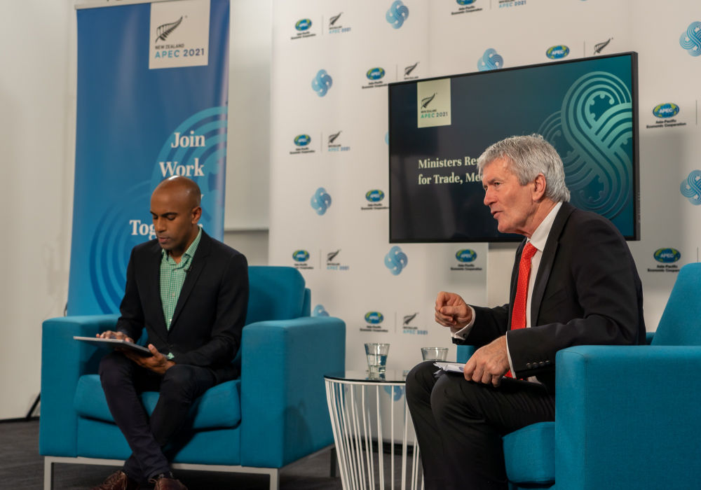 6月5日,2021年亚太经合组织贸易部长会议主席、新西兰贸易部长达明·奥康纳(右)在新西兰惠灵顿出席亚太经合组织成员贸易部长视频会议新闻发布会。(新华社发)