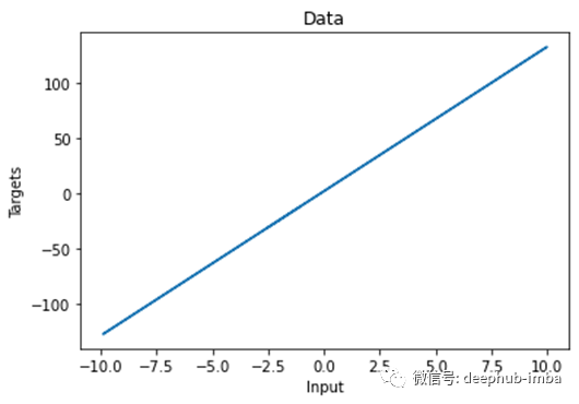# Plot x and targetsplt.plot(x,targets)# Add labels to x axis and y axisplt.ylabel('Targets')plt.xlabel('Input')# Add title to the graphplt.title('Data')# Show the plotplt.show()