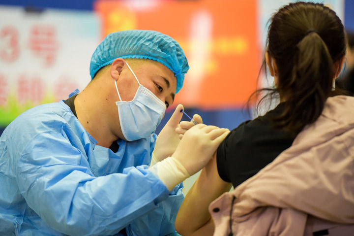 11月12日,在内蒙古自治区呼和浩特市,医务人员为市民接种新冠病毒疫苗。(新华社记者李志鹏 摄)