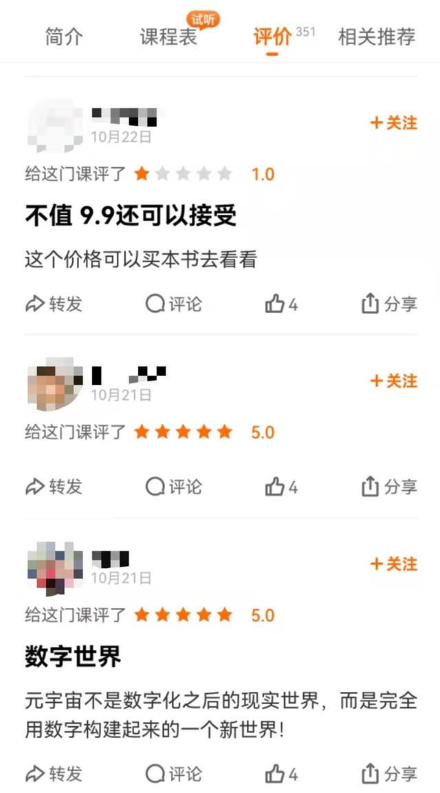 一名听过该课程的网友表示,自己听完后对元宇宙有了初步了解,但是几节课都在重复讲基础概念,对元宇宙未来形态的许多论断都建立在假设的基础之上,解释得不够清楚。也有人评论称不值这个价,不如去买本书看。