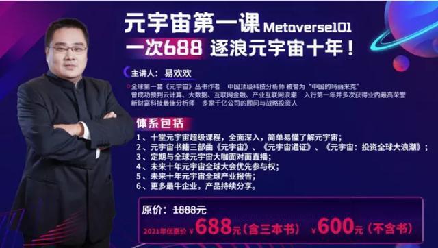 《元宇宙》丛书作者易欢欢主讲的网课《元宇宙第一课》,每人收费高达600元,课程体系包含10堂直播课程,再加88元还能获得3本元宇宙书籍。